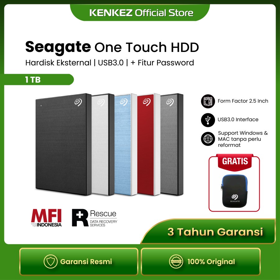 Form Factor: 2.5Inch Interface: USB3.2 Gen 1 (USB3.0 Compatible) Kapasitas: 1TB Support OS Windows & Mac Tanpa Perlu Format Ulang Lapisan Logam bertekstur cantik yang cocok dengan elemen gaya hidup Modern. Garansi Resmi 3 Tahun Garansi Seagate Rescue 3 Tahun